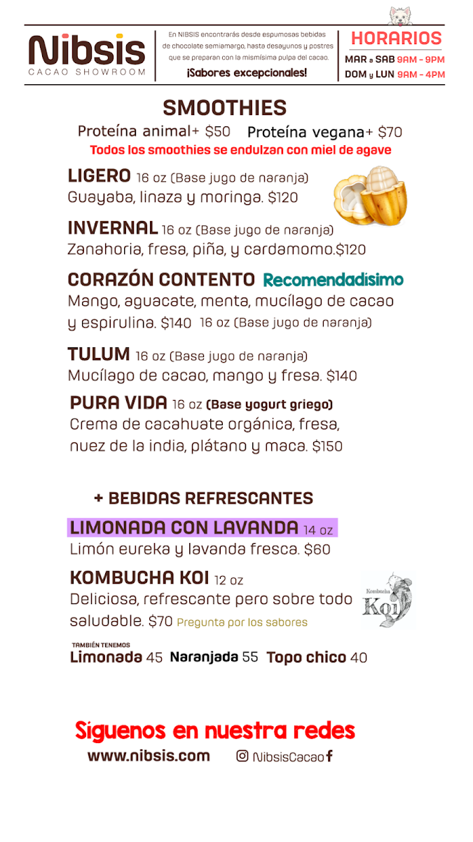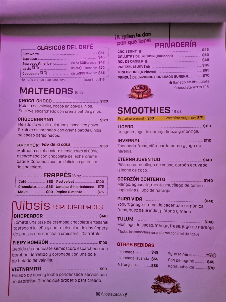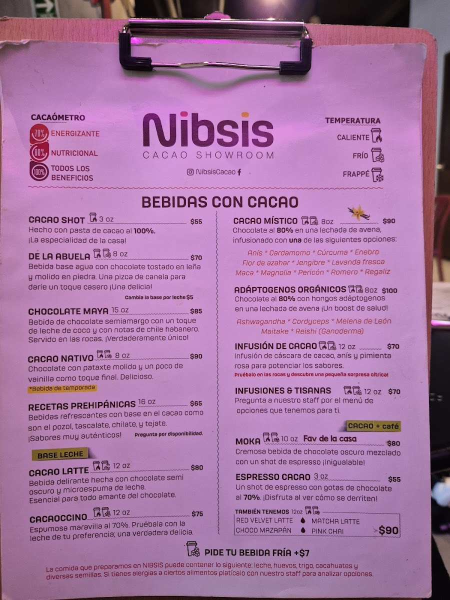 Nibsis specializes in an array of mouthwatering offerings that elevate cacao to an art form. Their menu features a splendid variety of options, each more enticing than the last. Savor the Tarta De Chocolate Con Queso Azul, an indulgent personal tart with rich chocolate and a sophisticated blue cheese twist for just MX$130.00. For those with a flair for breakfast or brunch, the Pancakes De Cacao are a must-try – four fluffy pancakes infused with cacao, served with a choice of toppings and crunchy nibs for MX$190.00 that promises a blissful start to your day.